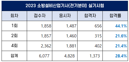 4회 소방설비산업기사 전기분야 실기 합격률은 21.4%이고, 2023년 평균 합격률은 28.4%입니다.
