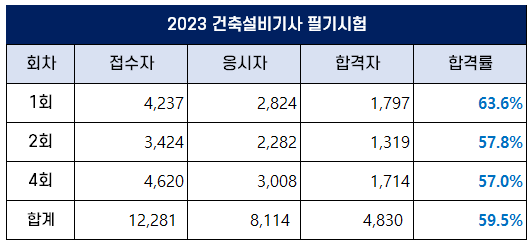 4회 건축설비기사 필기 합격률은 57.0%이며, 2023년 평균 합격률은 59.5%입니다.