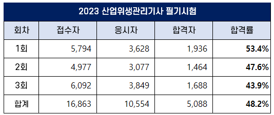 이번 포스팅에서는 2023년에 시행된 1회, 2회, 3회 산업위생관리기사 필기시험과 실기시험의 원서접수인원, 응시인원, 합격인원 및 합격률을 정리했습니다. 2022년까지 시행된 산업위생관리기사 합격률은 하단에 링크를 첨부한 포스팅을 참고하세요.
