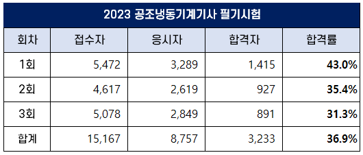 이번 포스팅에서는 2023년에 시행된 1회, 2회, 3회 공조냉동기계기사 필기시험과 실기시험의 원서접수인원, 응시인원, 합격인원 및 합격률을 정리했습니다. 2022년까지 시행된 공조냉동기계기사 합격률은 하단에 링크를 첨부한 포스팅을 참고하세요.