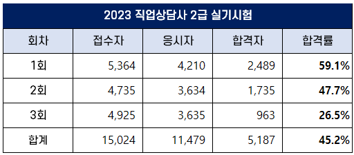 3회 직업상담사 2급 실기 합격률은 26.5%로 가장 낮았고, 2023년 평균 합격률은 45.2%입니다.