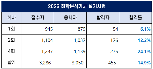 4회 화학분석기사 실기 합격률은 24.1%이고, 2023년 평균 합격률은 14.9%입니다.