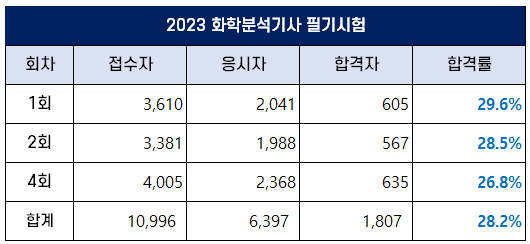 4회 화학분석기사 필기 합격률은 26.8%이며, 2023년 평균 합격률은 28.2%입니다.