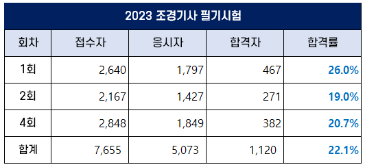 4회 조경기사 필기 합격률은 20.7%이며, 2023년 평균 합격률은 22.1%입니다.