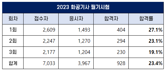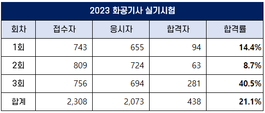 3회 화공기사 실기 합격률은 40.5%로 가장 높았고, 2023년 평균 합격률은 21.1%입니다.