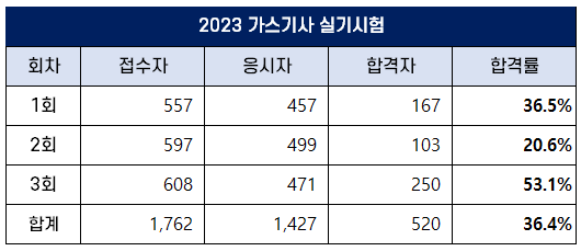 3회 가스기사 실기 합격률은 53.1%이고, 2023년 평균 합격률은 36.4%입니다.