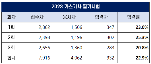2023년 제1회 가스기사 필기시험에는 2,862명이 원서접수를 했는데 이 중 1,506명이 응시했고, 응시자 중 347명이 합격해 23.0%의 합격률을 기록했습니다.