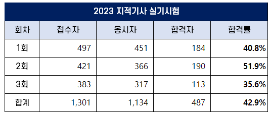 3회 지적기사 실기 합격률은 35.6%로 가장 낮았고, 2023년 평균 합격률은 42.9%입니다.