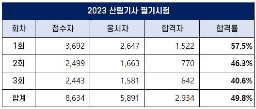 3회 산림기사 실기 합격률은 70.3%로 가장 높았고, 2023년 평균 합격률은 57.0%입니다.