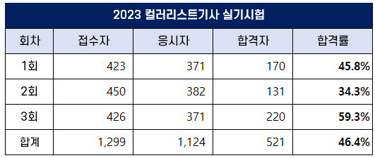 3회 컬러리스트기사 실기 합격률은 59.3%이고, 2023년 평균 합격률은 46.4%입니다.