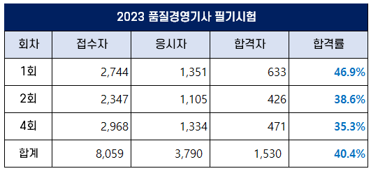 4회 품질경영기사 필기 합격률은 35.3%이며, 2023년 평균 합격률은 40.4%입니다.