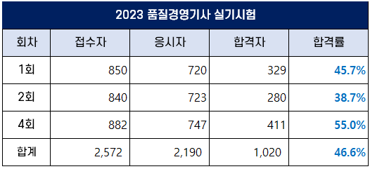 4회 품질경영기사 실기 합격률은 55.0%이고, 2023년 평균 합격률은 46.6%입니다.