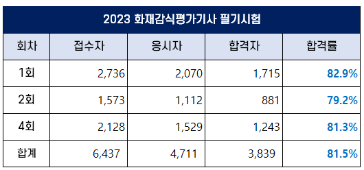 4회 화재감식평가기사 필기 합격률은 81.3%이며, 2023년 평균 합격률은 81.5%입니다.