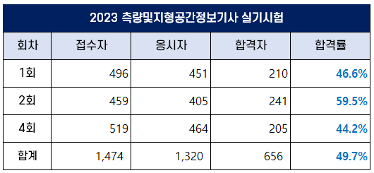 2023년 제1회 측량및지형공간정보기사 실기시험에는 496명의 원서접수자 중 451명이 시험에 응시했는데 210명이 합격해 46.6%의 합격률을 기록했습니다.