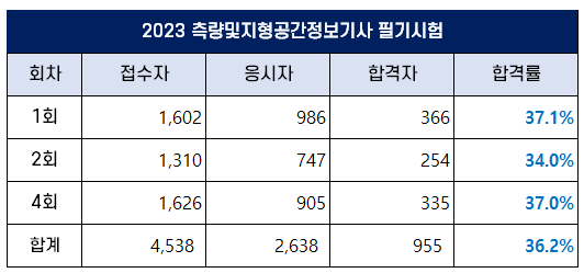 4회 측량및지형공간정보기사 필기 합격률은 37.0%이며, 2023년 평균 합격률은 36.2%입니다.