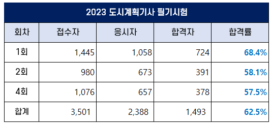 4회 도시계획기사 필기 합격률은 57.5%이며, 2023년 평균 합격률은 62.5%입니다.