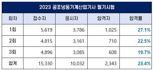 2023년 제1회 공조냉동기계산업기사 필기시험에는 5,619명이 원서접수를 했는데 이 중 3,786명이 응시했고, 응시자 중 1,025명이 필기시험에 합격해 합격률은 27.1%를 기록했습니다.