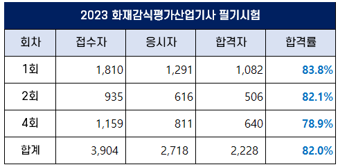 2023년 제1회 화재감식평가산업기사 필기시험에는 1,810명이 원서접수를 했는데 이 중 1,291명이 응시했고, 응시자 중 1,082명이 합격해 합격률은 83.8%를 기록했습니다.