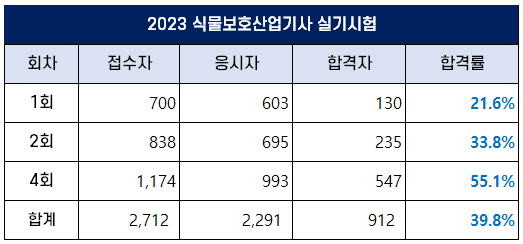 4회 식물보호산업기사 실기 합격률은 55.1%이고, 2023년 평균 합격률은 39.8%입니다.