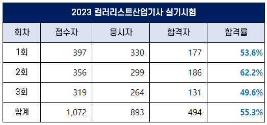 3회 컬러리스트산업기사 실기 합격률은 49.6%로 가장 낮았고, 2023년 평균 합격률은 55.3%입니다.