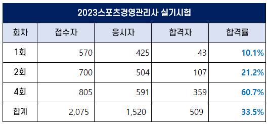 이번 포스팅에서는 2023년에 시행된 1회, 2회, 4회 스포츠경영관리사 필기시험과 실기시험의 원서접수인원, 응시인원, 합격인원 및 합격률을 정리했습니다. 2022년까지 시행된 스포츠경영관리사 합격률은 하단에 링크를 첨부한 포스팅을 참고하세요.