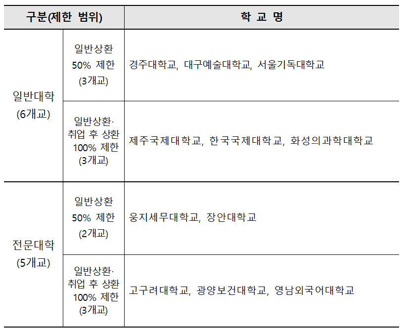 2024학년도에 적용되는 정부 재정지원제한 대학은 총 11개교(일반대학 6개교, 전문대학 6개교)가 지정되었는데요. 국가장학금 Ⅱ유형 및 일반 학자금 대출 지원 50%를 제한 받는 재정지원제한대학 Ⅰ 유형이 5개교(일반대학 3개교, 전문대학 2개교)이고, 국가장학금 Ⅰ, Ⅱ 유형 및 일반·취업 후 상환 학자금 대출 지원 100%를 제한 받는 재정지원제한대학 Ⅱ유형이 6개교(일반대학 3개교, 전문대학 3개교)입니다.