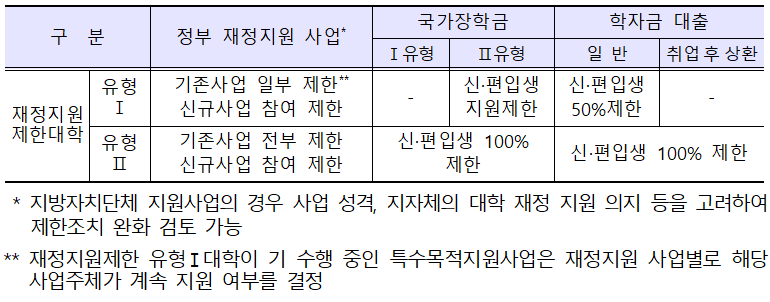 2023학년도 재정지원대학으로 지정되었던 일반대학 4개교(극동대학교, 서울한영대학교, 한국침례신학대학교, 신경대학교)와 전문대학 7개교(동의과학대, 수원과학대, 신안산대, 전주기전대, 창원문성대, 강원관광대, 김포대)는 2024학년도부터 정부 재정지원제한대학에서 해제되어 정부재정지원사업에 참여가 허용되고, 국가장학금과 학자금 대출제한도 해제됩니다.