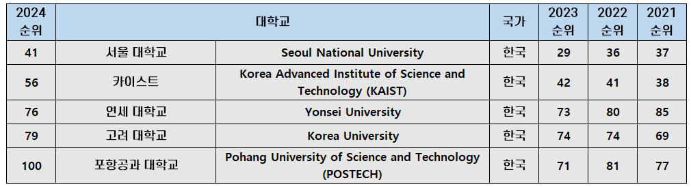 서울대학교가 41위, 카이스트가 56위를 차지하며 국내 대학 중에서는 가장 높은 순위를 기록했습니다.