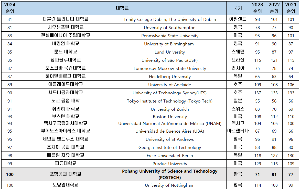 국내 포항공대도 71위에서 100위로 순위가 29단계 하락했습니다.