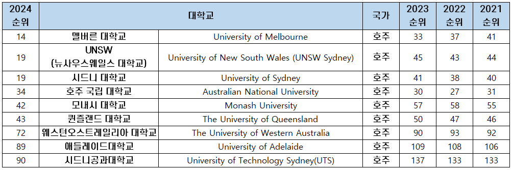 2024년 QS 세계 대학 순위의 특징은 호주 대학의 순위가 크게 상승한 것인데요. 2023년 100위 권 안에 7개 대학이 있었던 호주는 2024년에 애들레이드 대학교(University of Adelaide)와 시드니공과대학교(UTS)가 새롭게 100위권 안에 진입하면서 9개 대학이 TOP 100에 들었습니다. 또한 순 위권 안에 든 대부분의 호주 대학 순위가 전년도보다 상승해면서 멜버른 대학교의 경우 33위에서 14위로 순위가 큰 폭으로 상승했습니다.