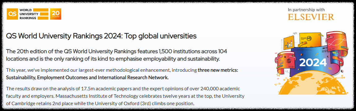 영국 현지 시간으로 2023년 6월 27일 2024년 QS 세계 대학 순위 (QS World University Rankings 2024)가 발표되었습니다.