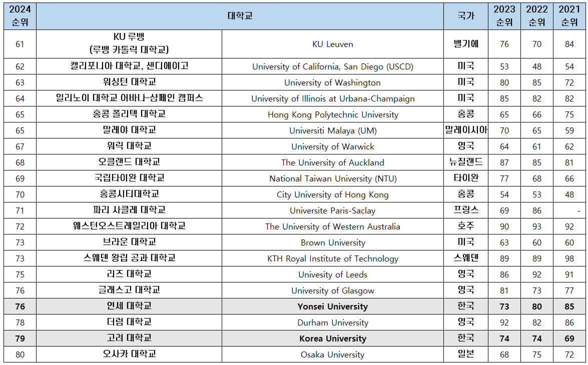 국내 대표적인 사립 명문 대학인 연세대학교는 76위, 고려대학교는 79위입니다.