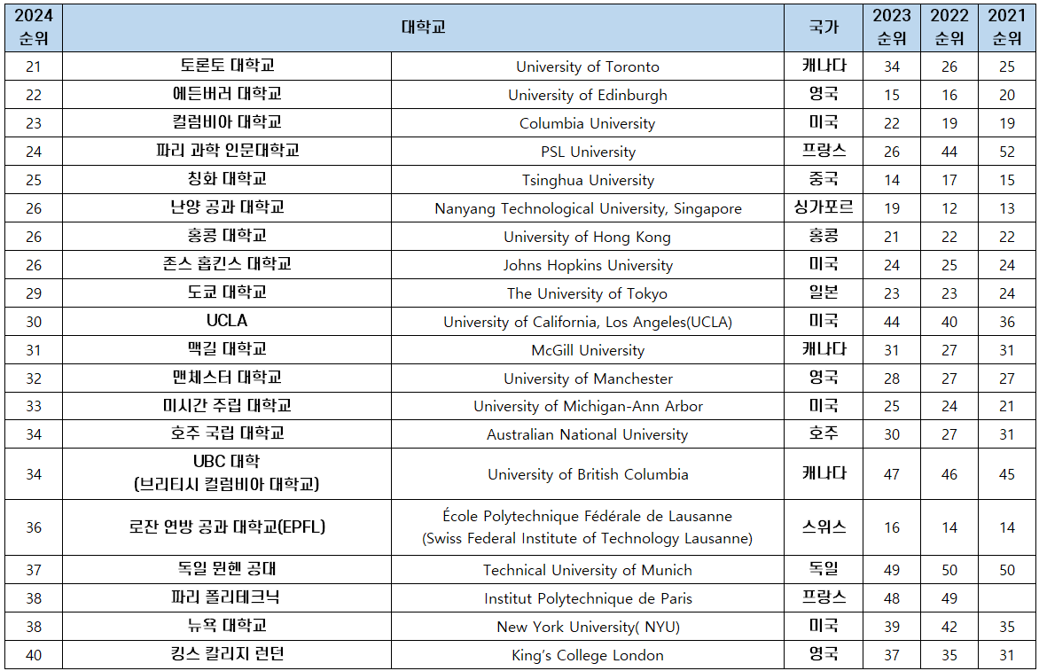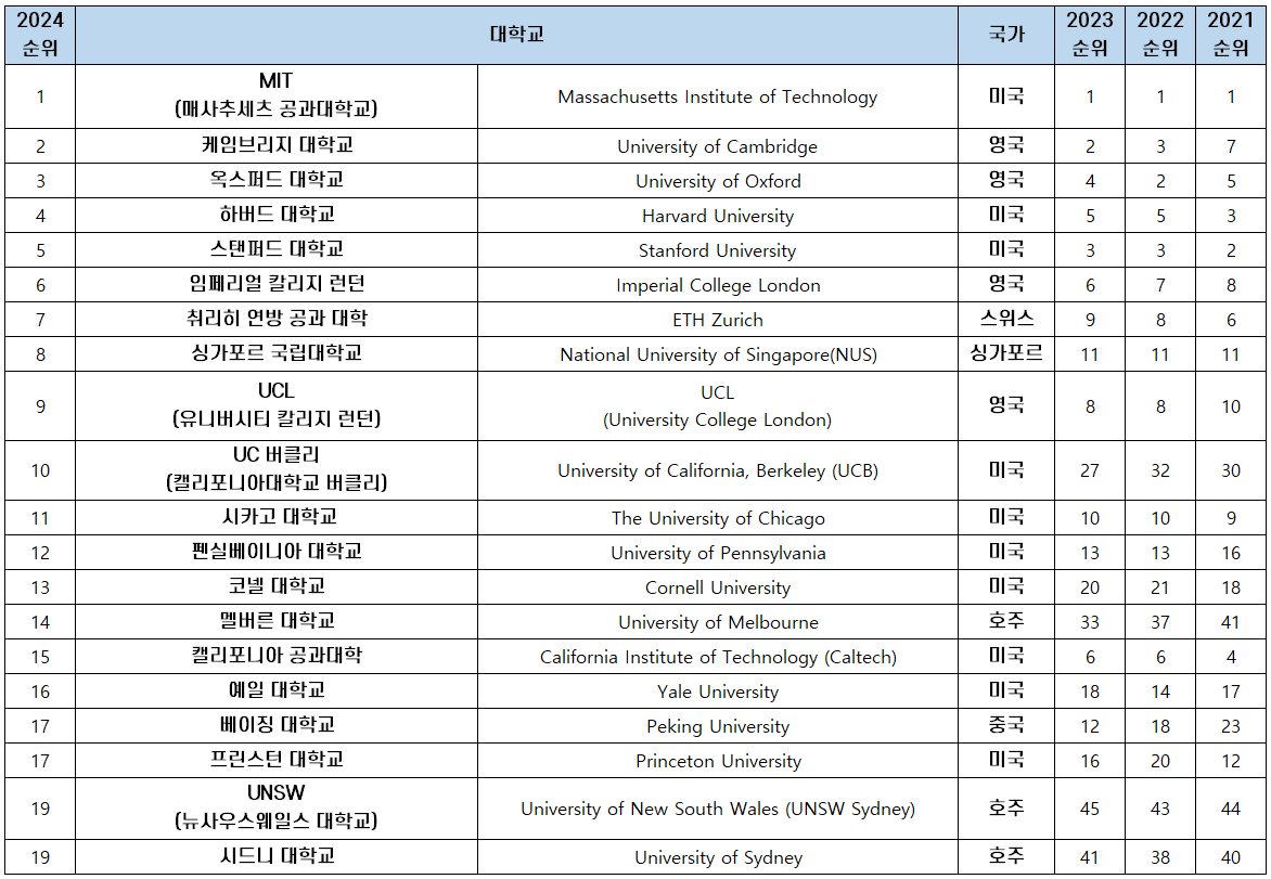 호주의 시드니공과대학교(University of Technology Sydney)가 지난해 137위에서 2024년 90위로 순위가 47단계 상승한 반면, 일본의 도쿄공업대학교(Tokyo Institute of Technology)는 55위에서 91위로 순위가 대폭 하락했습니다.