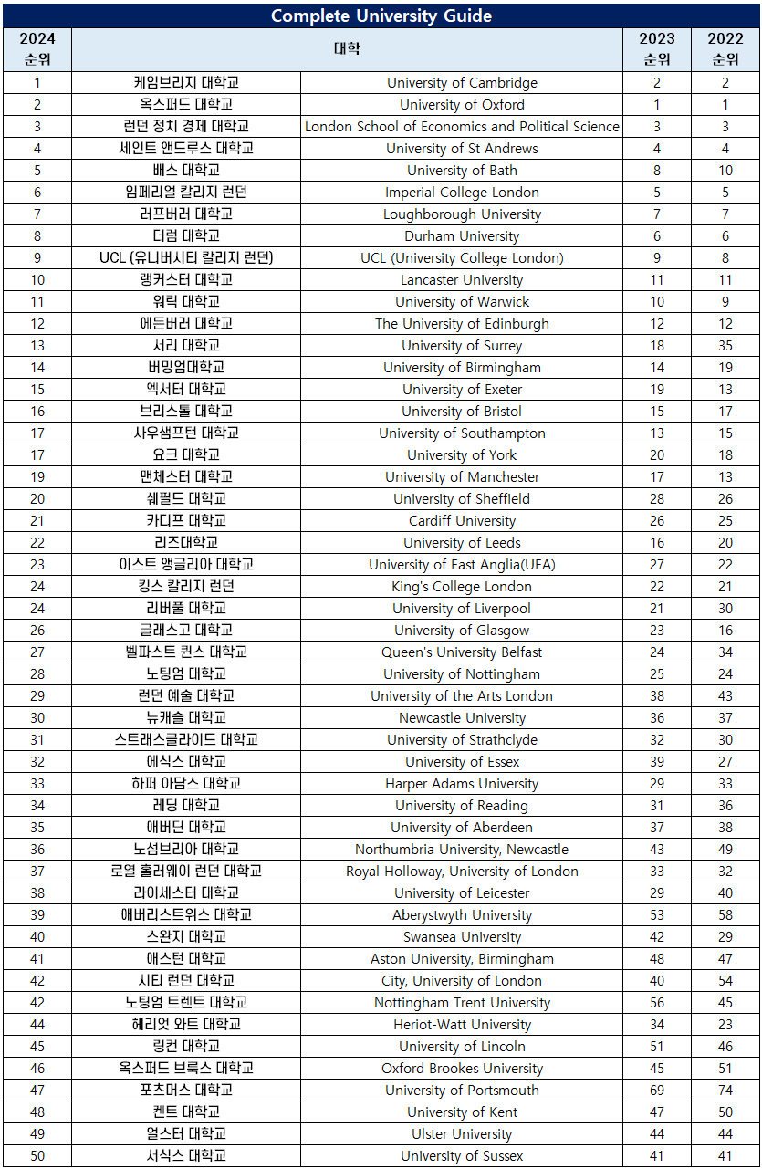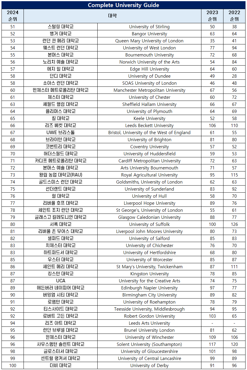 2024 Complete University Guide에 포함된 130개 대학 중 영국 대학 순위 1위부터 100위까지를 아래 표로 정리했습니다(모바일 환경에서 표가 깨져 보이는 경우 아래 그림을 보세요).
