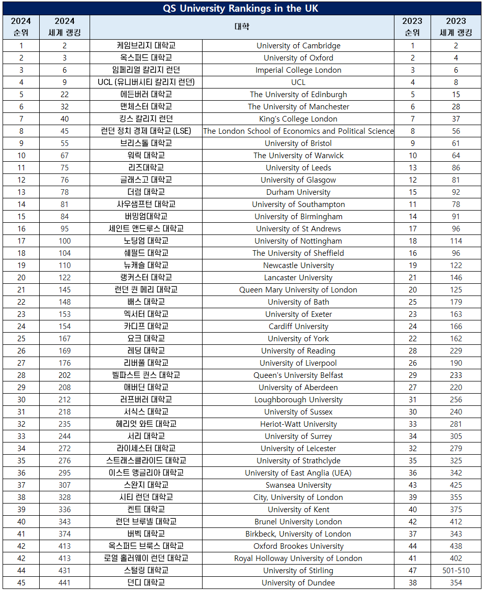 이번 포스팅에서는 2023년 6월에 발표된 2024 QS World University Rankings 중에서 영국 대학의 순위를 정리했는데요. 영국 대학 입시를 준비하는 수험생이나 학부모를 위해 영국 대학만 평가한 영국 대학 순위는 아래 포스팅을 보시기 바랍니다.