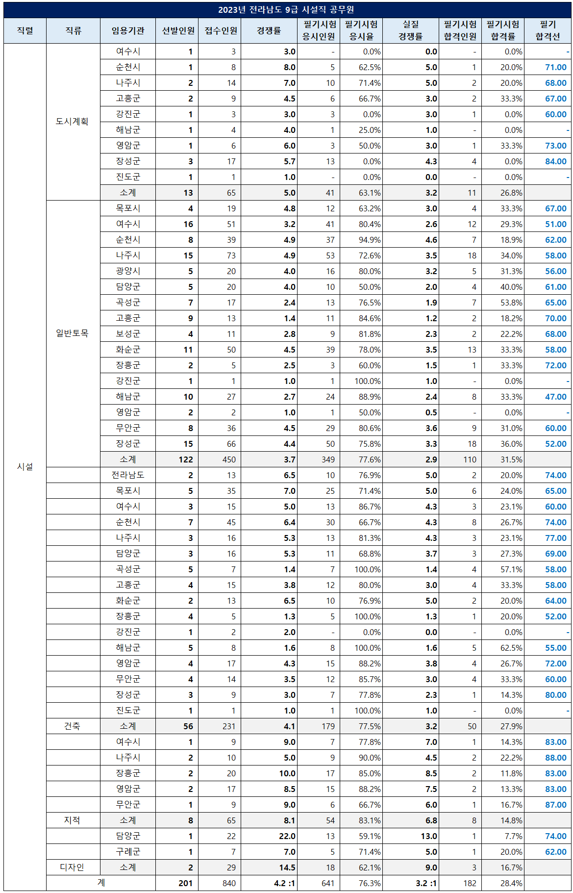 도시계획직은 5.7대 1의 경쟁률을 보인 장성군의 필기 합격선이 84점으로 가장 높았고, 3.0대 1의 경쟁률을 기록한 강진군의 커트라인이 60점으로 가장 낮았습니다.