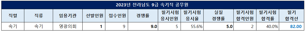 영광의회가 임용하는 속기직의 경쟁률은 9.0대 1이었고, 필기 합격선은 82점입니다.