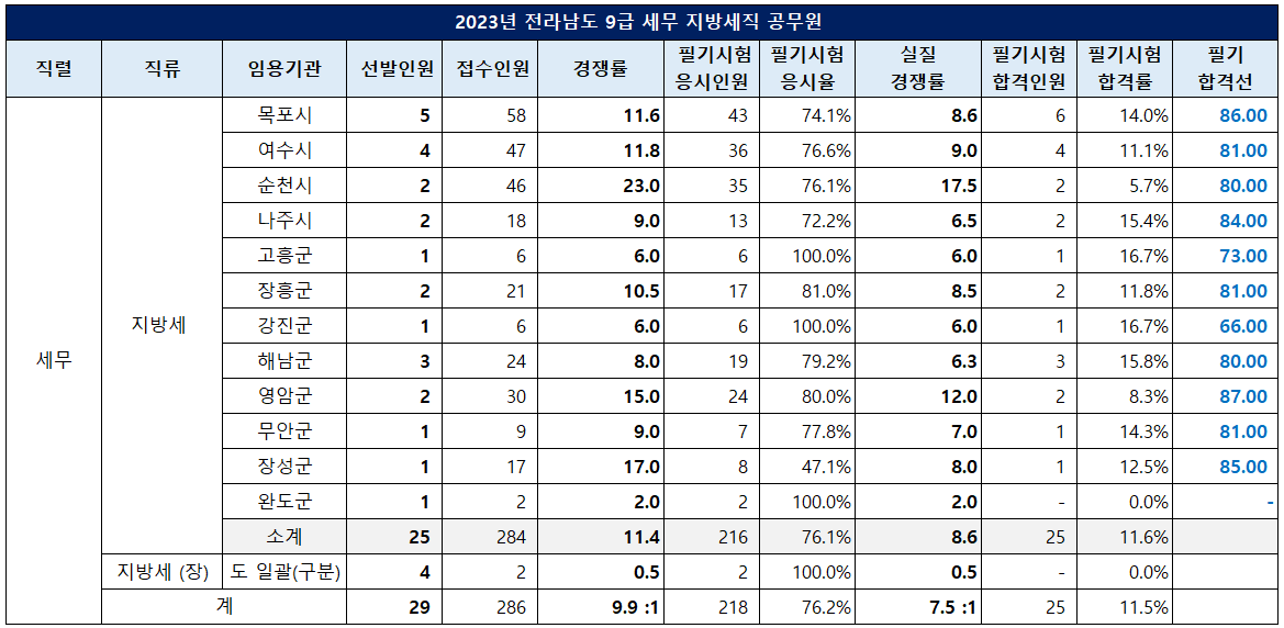 2023년 전남 지방직 공무원 9급 공채 세무(지방세) 일반 모집으로 총 25명을 선발하는데 284명이 원서접수를 해 11.4대 1의 경쟁률을 기록해, 지난해 경쟁률 9.4대 1보다 상승했습니다.