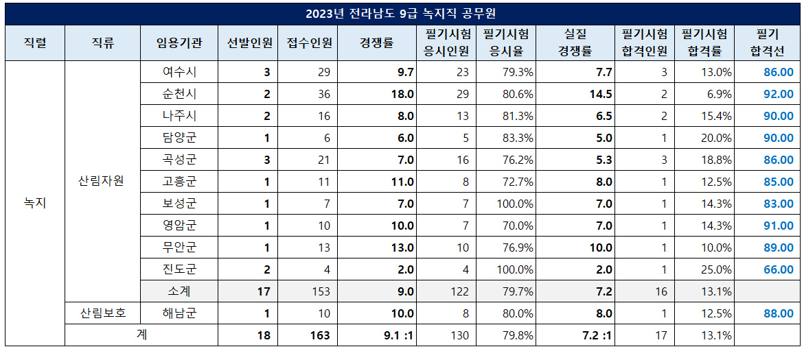 이번 포스팅에서는 전라남도 지방직 공무원 9급 공채 모집 직렬 별 선발예정인원, 원서접수인원, 경쟁률, 필기시험 응시인원, 합격인원, 합격선 등에 대해 정리했습니다.