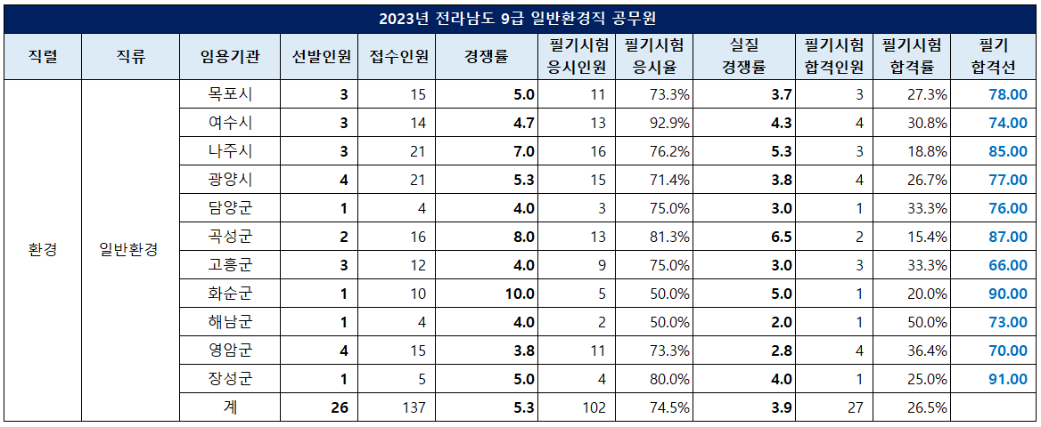 전라남도 일반환경직 공무원은 26명을 선발하는데 137명이 원서접수를 해 5.3대 1의 경쟁률을 기록했고, 102명이 필기시험에 응시해 74.5%의 필기 응시율과, 3.9대 1의 실질 경쟁률을 보였습니다.
