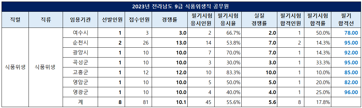 전남 식품위생직 합격선은 10대 1의 경쟁률을 보인 영광군이 96점으로 가장 높았고, 여수시의 커트라인이 78점으로 가장 낮았습니다.