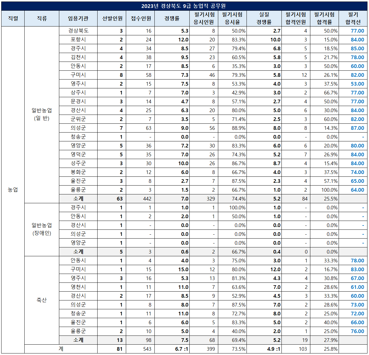 일반수산직은 3.0대 1의 경쟁률을 보인 영덕군의 필기 합격선이 81점을 기록했습니다.