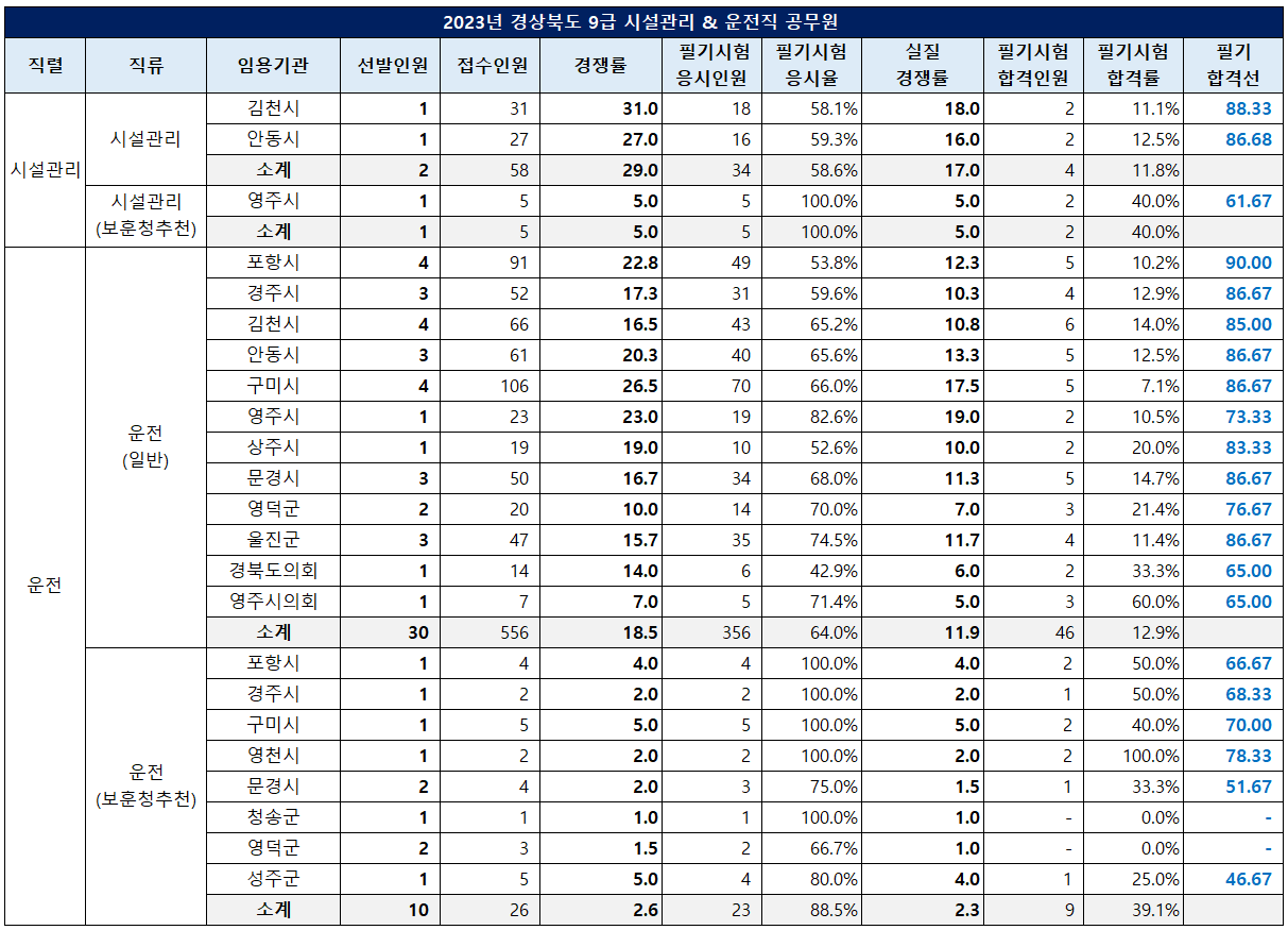 경북 시설관리직은 31.0대 1의 경쟁률을 보인 김천시 필기 합격선이 88.3점, 27.0대 1의 경쟁률을 보인 안동시 커트라인이 86.68점이었습니다.