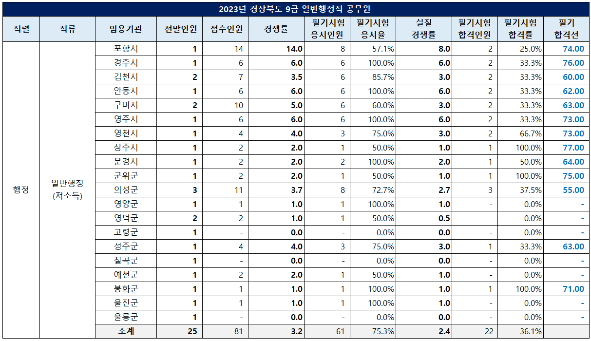 경상북도 일반행정직 저소득 모집은 25명을 선발하는데 81명이 지원해 평균 3.2대 1의 경쟁률을 기록했고, 고령군과 칠곡군은 지원자가 없어 미달입니다. 필기 합격선은 상주시가 77점으로 가장 높았고, 의성군이 55점으로 가장 낮았습니다.