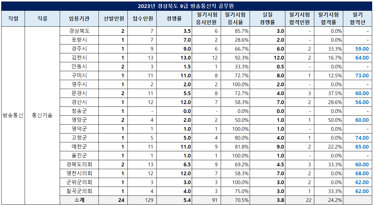 예천군은 필기 합격자가 없었고, 2.6대 1의 경쟁률을 보인 군위군 일반토목직 필기 커트라인이 53점으로 가장 낮았습니다.