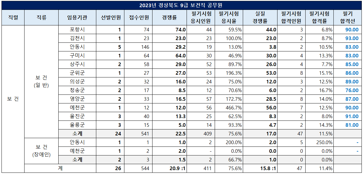 경북 보건직 필기 합격선은 김천시가 93점으로 가장 높았고, 청송군이 76점으로 가장 낮았습니다.
