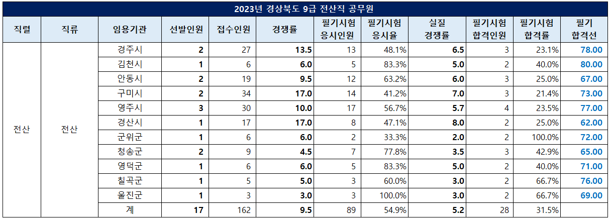 2023년 경북 전산직은 17명을 선발하는데 162명이 원서접수를 해 9.5대 1의 경쟁률을 보였고, 89명이 필기시험에 응시해 54.9%의 응시율과 5.2대 1의 실질 경쟁률을 기록했으며 28명이 합격해 31.5%의 합격률을 나타냈습니다.