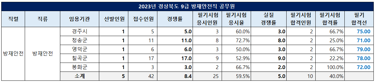 방재안전직 필기 합격선은 6.0대 1의 경쟁률을 보인 영덕군이 79점으로 가장 높았고, 11.0대 1의 경쟁률을 보인 청송군이 71점으로 가장 낮았습니다.