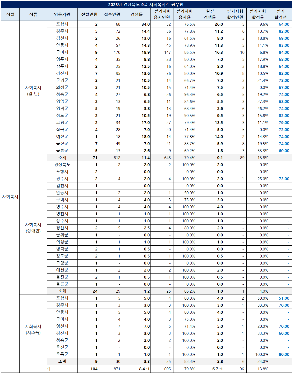 사회복지직의 필기 합격선은 2.6대 1의 경쟁률을 보인 울릉군이 60점으로 가장 낮았습니다.
