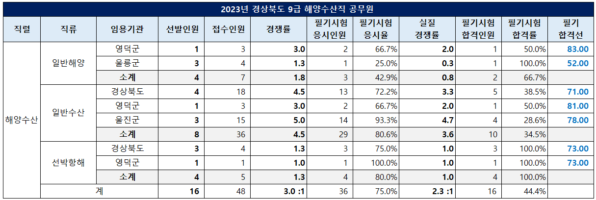 일반해양직은 영덕군의 경쟁률이 3.0대 1이고, 필기 합격선이 83점이었습니다.